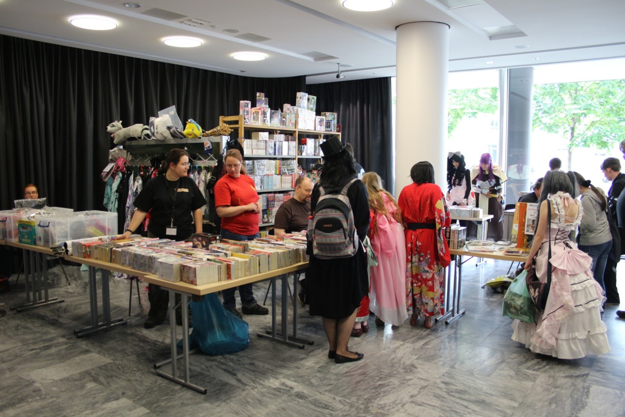 Begeben wir uns aber nun in das Gebäude – vorbei am Ticketverkauf und den Einlasskontrollen. Die Einteilung bleibt sich wie in den letzten Jahren treu. Im Erdgeschoss kommt der Besucher erst an weiteren Händlern vorbei und entscheidet sich am anderen Ende entweder im Erdgeschoss zu bleiben oder in den ersten Stock zu gehen. Im Erdgeschoss befinden sich der Gamesroom, Bring & Buy, Karaoke sowie die Workshopräume 1 und 2. Auch das Con-Büro für Anliegen der Besucher ist dort zu finden.