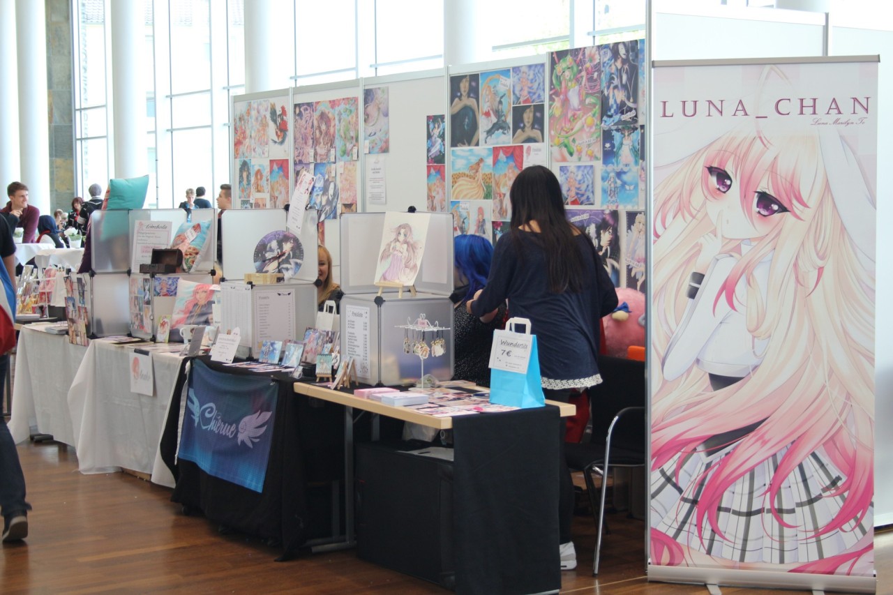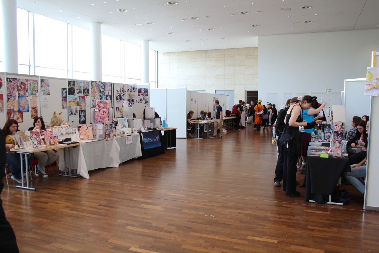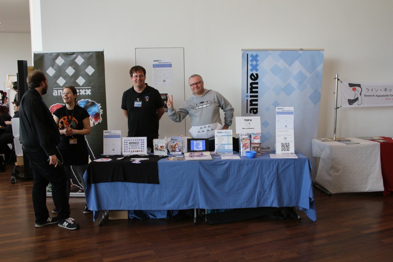 Im ersten Stock ist ebenfalls alles beim Alten: Fanwork Stände, Maid-Cafe, Zugang zum Konzertsaal und auch das Catering der Location. Aber auch ein weiterer Workshopraum und Fanstände sind hier zu finden. Ebenso war der Stand vom Animexx e.V. – Veranstalter der Convention – gut positioniert.