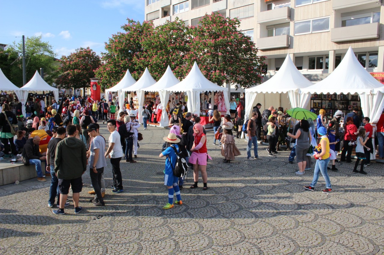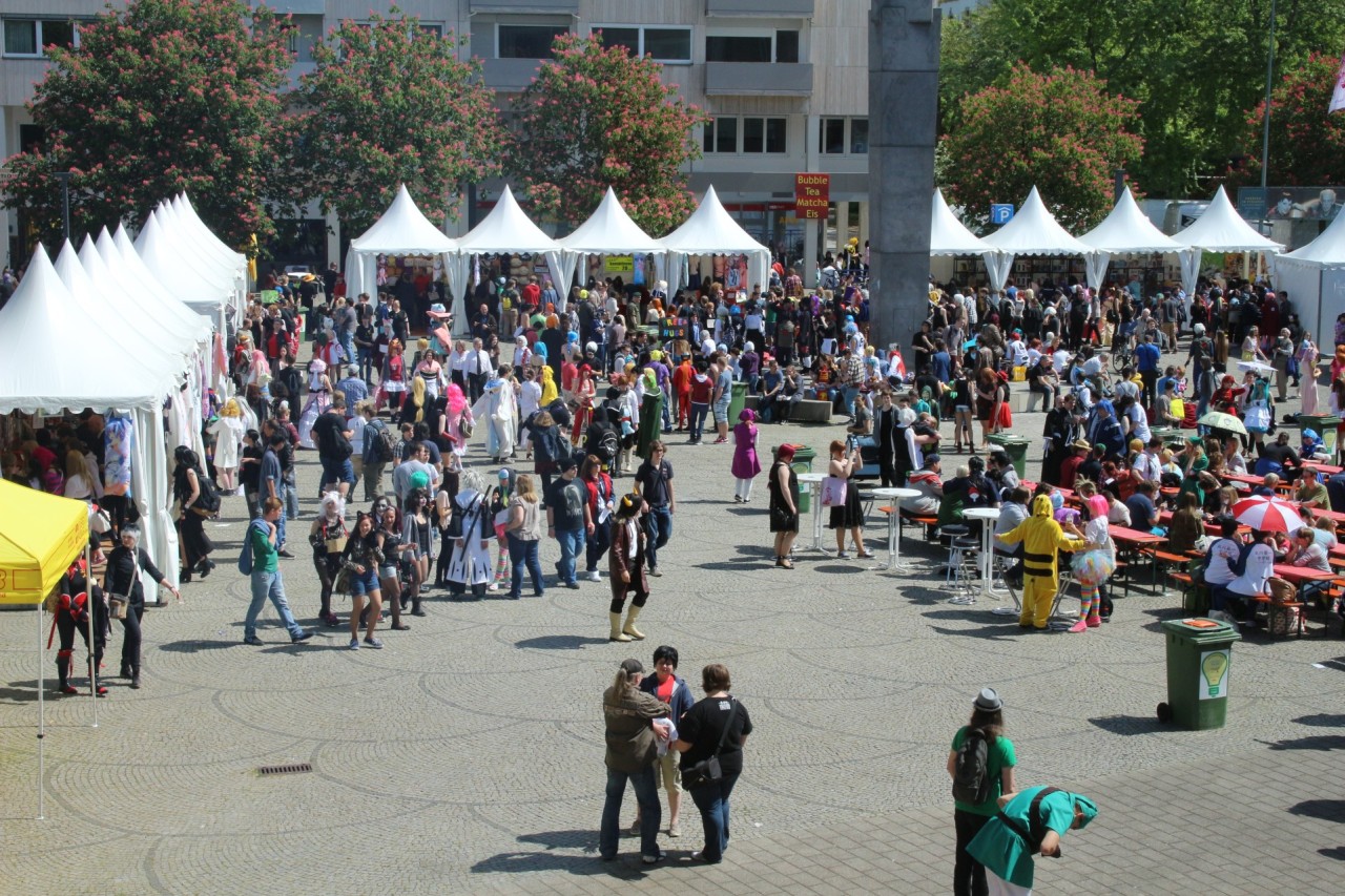 Vor Ort bietet sich einem direkt das Motto der Hanami: „Con meets Festival“. Denn rund um den Vorplatz des Pfalzbaus reihen sich weiße Pavillons dicht an dicht, in denen die Händler ihr Merchandise anbieten. Außerdem stehen auf dem Platz auch eine Außenbühne, ein Zelt für Verpflegung und Sitzgelegenheiten. Das schöne am Vorplatz und besonders lukrativ für Händler ist, dass auch Interessierte ohne Eintrittskarte den Bereich betreten können. Gleichzeitig kann das allerdings störend werden, wenn nachmittags Szenefremde die Location betreten und mit beleidigenden Kommentaren die Besucher der Convention nerven. Denn der Pfalzbau liegt nicht gerade in einem der schönsten Wohngebiete Wiesbadens, das muss leider angemerkt werden.
