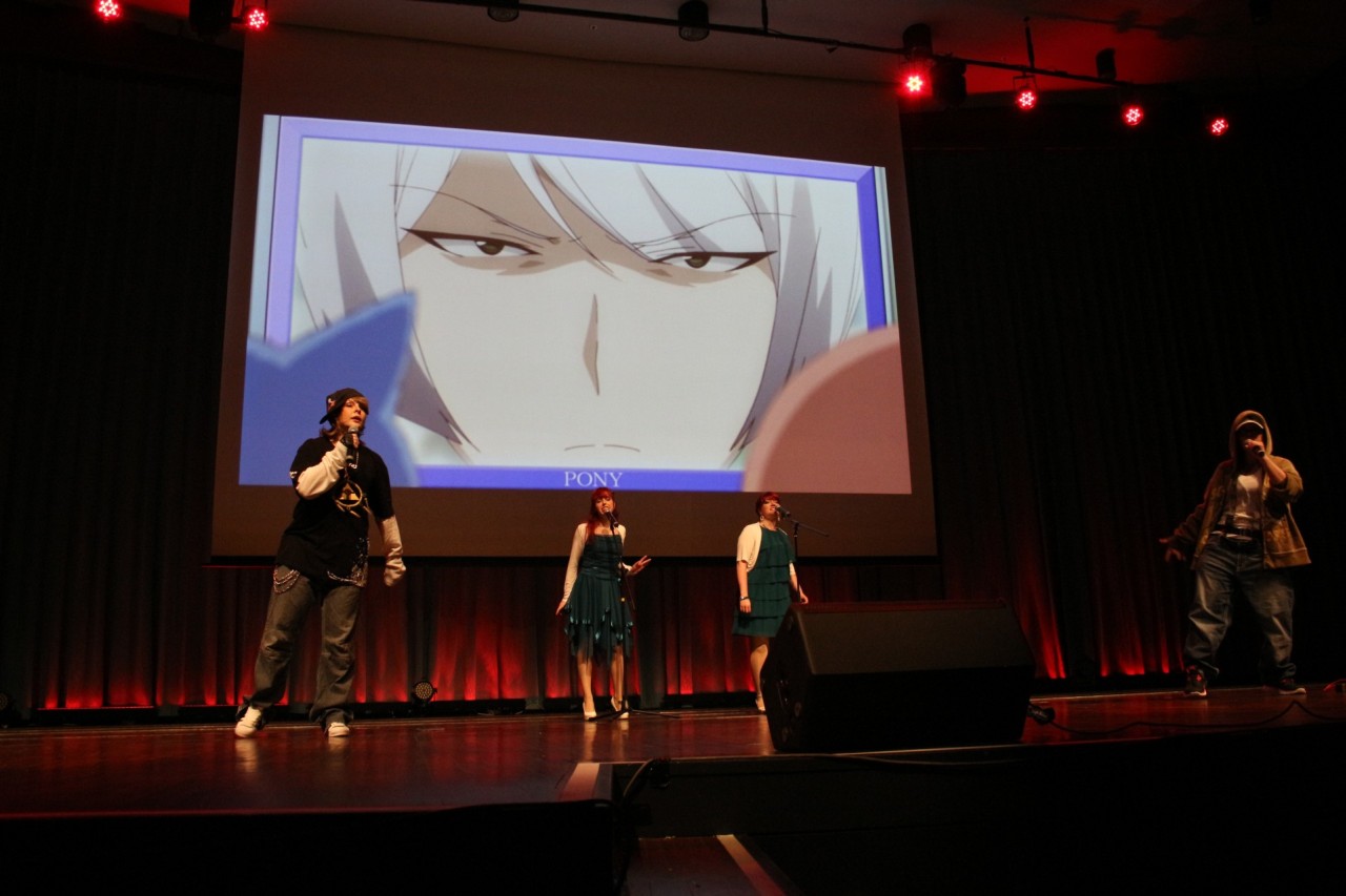 Als letzte Showgruppe an diesem Convention-Wochenende zündete Ongaku no Kara ein Feuerwerk an Parodien und Medleys. Los ging es mit zwei Parodien zu Sailor Moon, darunter wurde Falcos Hit „Jeanny“ neu interpretiert – mit passendem Musikvideo. Danach wurde es etwas ruhiger mit dem dramatischen Cover aus Dr. Who „Abigail’s Song“. Es wurde wunderschön vorgetragen! Danach wurde es wieder lustig mit einer Parody über jemanden, der unbedingt YouTube-Star werden will. Auch wenn es überspitzt war – wie aus dem echten Leben gegriffen. Dann ging es Assassin’s Creed an den Kragen. Mit einer Assassin’s Creed Unity Parody und einer umgeschriebenen Version von „Atemlos“ sprachen bzw. sangen Ongaku no Kara einigen Fans wohl aus der Seele. Es wurde so ziemlich jeder kleiner Fehler des Spiels aufs Korn genommen. Der Beifall am Schluss bestätigte dazu die allgemeine Meinung zum Spiel. Als wir dachten, es könne eigentlich nicht besser werden, gab es eine weitere Parody, diesmal über Shingeki no Kyojin. Der Hit von Reinhard Mey – Über den Wolken wurde kurzerhand zu „Hinter den Mauern“. Um sich etwas vom vielen lachen zu entspannen gab es einen japanischen Schlager zu hören, einen sogenannten „Enka“. Aber gleich danach wurde es wieder witzig mit dem altbekannten Dr. Who Medley – zusammengesetzt aus einigen bekannten Melodien – natürlich wieder passend umgetextet. Im Anschluss wurden die Cosplayer aufs Korn genommen. Manche sind bekannter weise auch noch in der letzten Nacht vor einer Convention an ihren Kostümen am nähen – dies wurde mit dem Titel „Nur noch eine Nacht“ besungen. Und wo wir schon beim Thema Conventions sind – in einer Parody zu Binan wurde die unerwiderte Liebe zu einem Cosplayer besungen. Auch hier musste ein bekanntes Lied aus den Charts herhalten. Der Song „Ich lass für Dich das Licht an“ von Revolverheld wurde passend dazu umgedichtet. Zum Abschluss gab es dann noch ein tolles Cover aus dem Anime Chihiros Reise ins Zauberland. Aber eine Zugabe durfte natürlich nicht fehlen. Mit einer Parody zu Death Note und Cover von Taylor Swift „Blank Space“ verabschiedeten sich Ongaku no Kara von der Bühne. Es war mal wieder ein grandioser Auftritt dieser Showgruppe und man kann sie nur empfehlen. Wenn ihr also bei einem eurer Convention-Besuche mitbekommen solltet, das Ongaku no Kara auftritt, dann schaut die euch an. Zu so gut wie jedem Song gibt es auch ein Video zu sehen. Für gute Stimmung ist jedenfalls immer gesorgt. Auf manchen Conventions sind Ongaku no Kara aus noch als Akustikband unterwegs und spielt tolle Cover und Eigenkreationen live auf der Bühne – auch dieses Programm lohnt sich!